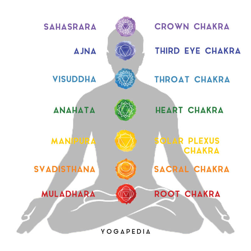 What is a Chakra? Chakra is a Sanskrit word meaning ‘wheel’ or ‘vortex’ of energy. In traditional Yogic teachings our body has 7 points of energy. These 7 chakras are shown in the picture bellow;
