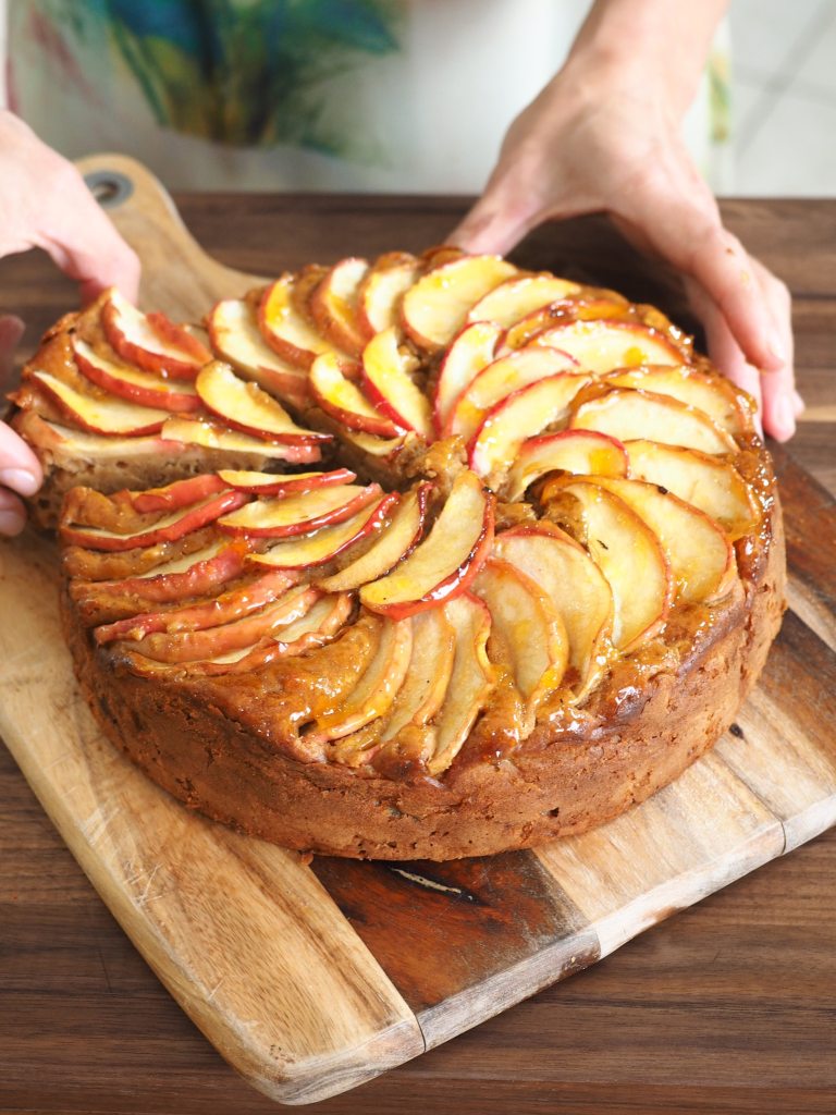 - Tip the cake batter into your greased and lined tin and gently smooth the top with the back of a wooden spoon. Arrange your apple slices on top and sprinkle a tablespoon of brown sugar as evenly as possible over the top of the cake.